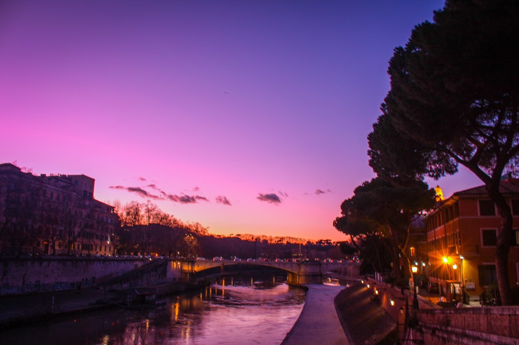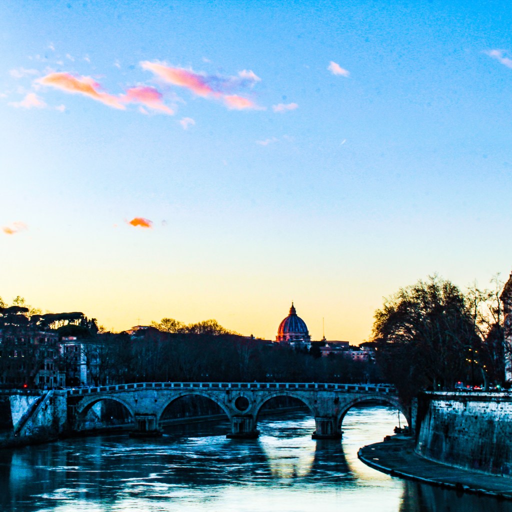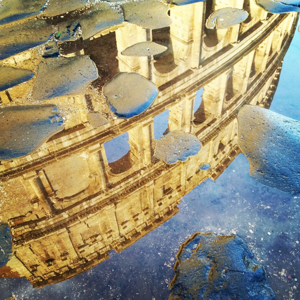 La bellezza di vivere nella Città Eterna. Uscire all’alba dopo una pioggia autunnale e vedere riflessi sorprendenti nelle pozzanghere, tra i sanpietrini